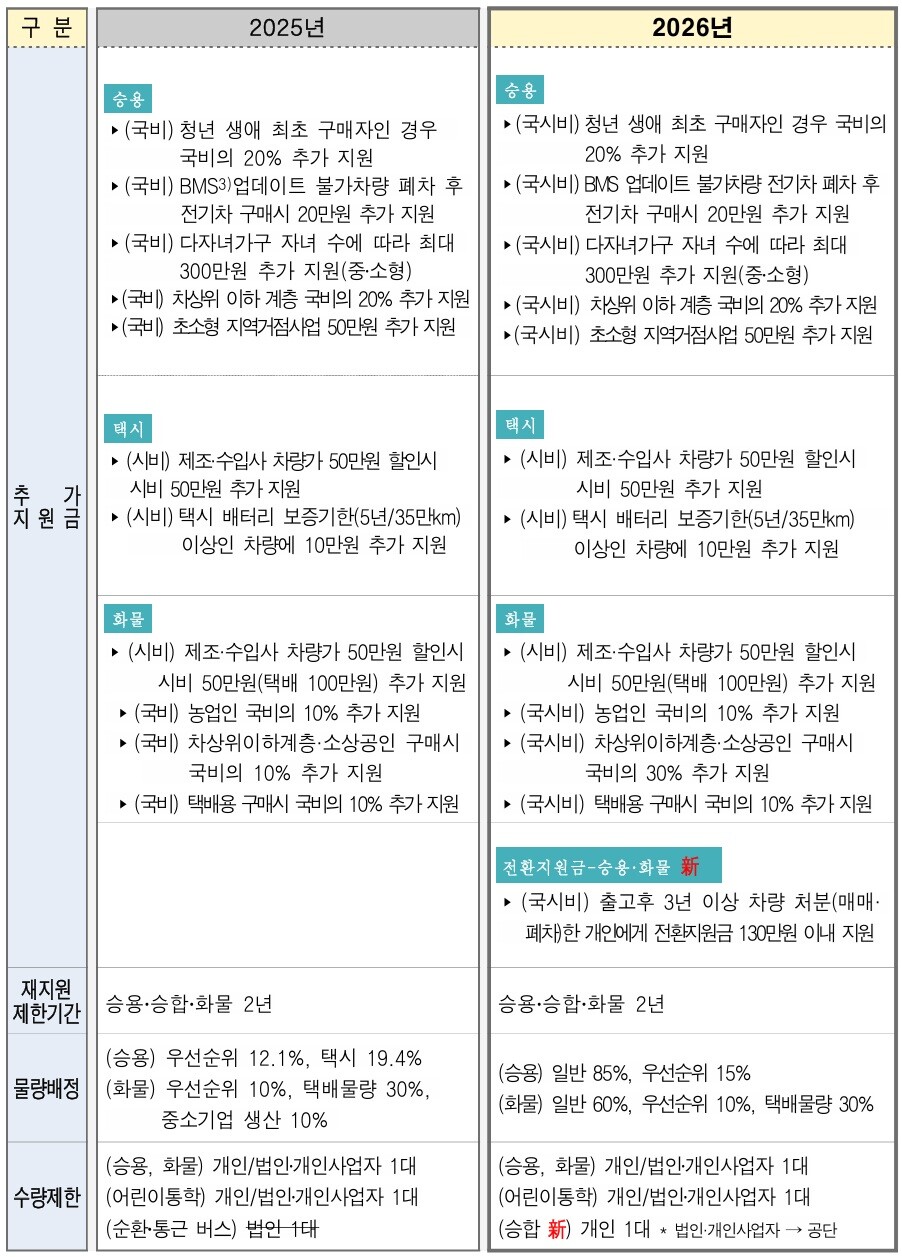 화물차 부문에서는 기존 소형 중심에서 벗어나 중·대형 전기화물차까지 지원을 확대한다. 소형은 최대 1,365만 원, 중형은 5,200만 원, 대형은 7,800만 원까지 지원되며, 생활권 중심으로 운행하는 택배차량에는 최대 150만 원의 추가 지원이 가능하다. 기존 경유화물차 폐차 및 영업 요건도 폐지돼 상용차 전환이 한층 빨라질 전망이다.