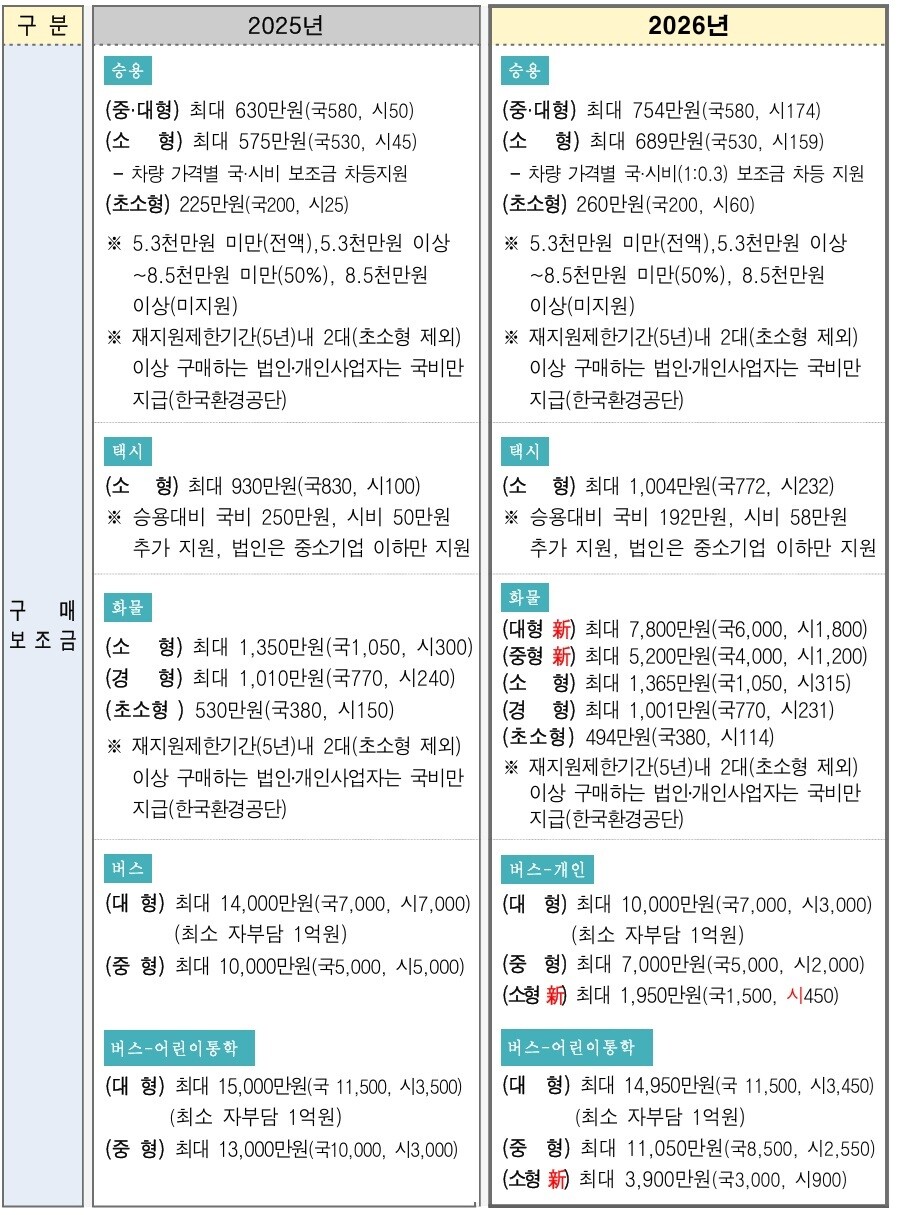 승합차와 버스도 지원 범위를 넓혔다. 올해부터 소형 전기승합차 지원이 신설돼 대형·중형·소형 모두 보급 대상에 포함된다. 어린이 통학버스는 대형 기준 최대 1억 4,950만 원까지 지원받을 수 있다.