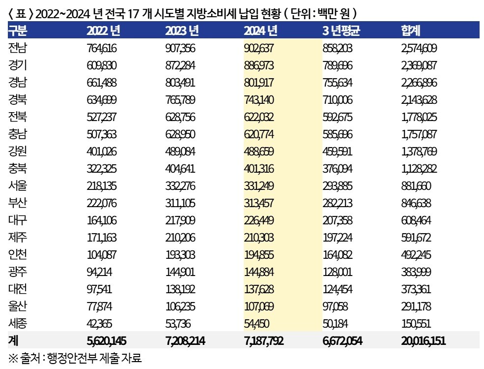 현행 지방세법은 지방소비세 세액의 일부를 지역균형발전특별회계사업 비용 보전과 지방자치단체 배분에 활용하도록 규정하고 있다. 행정안전부 자료에 따르면 2022년 5조 6,201억 원, 2023년 7조 2,082억 원, 2024년 7조 1,878억 원이 전국 17개 시·도와 226개 시·군·구에 배분됐다. 2024년 기준 전남(9,026억 원), 경기(8,870억 원), 경남(8,019억 원) 등이 가장 많은 배분을 받았다.