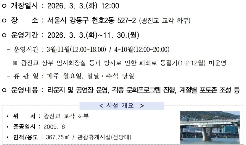 박진영 미래한강본부장은 “광진교 8번가는 한강의 탁 트인 전경과 문화가 어우러지는 특별한 공간”이라며 “도심 속 작은 힐링 공간에서 시민들이 행복한 경험을 하길 바란다”고 말했다.