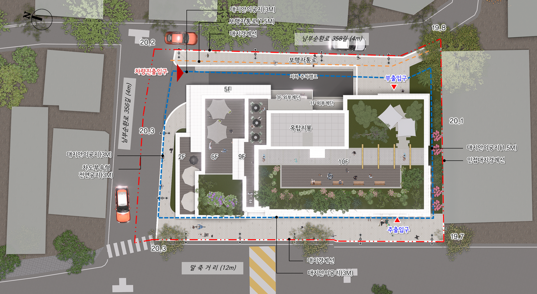 공공기여 차원에서는 지상 2층에 231㎡ 규모의 다목적 커뮤니티 공간을 마련해 골목상권 상인들의 상생 발전을 지원하고, 회의실·교육장 등으로 활용해 공공성을 확충한다. 또한 주차 출입구 차단기를 지하로 이전해 지상부 보행환경을 개선하도록 주문됐다.