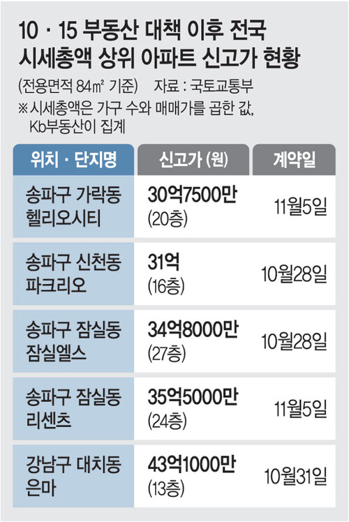14일 KB부동산에 따르면 지난달 16일 10·15 대책 시행 이후 전국 아파트 시세 총액 상위 10곳 가운데 8곳이 신고가를 갈아치웠다. 헬리오시티, 파크리오, 잠실엘스, 올림픽선수기자촌, 리센츠, 은마, 반포자이, 잠실주공5가 신고가 단지로 집계됐다. 시세총액은 단지 가구 수와 매매가격을 곱해 산정한다.