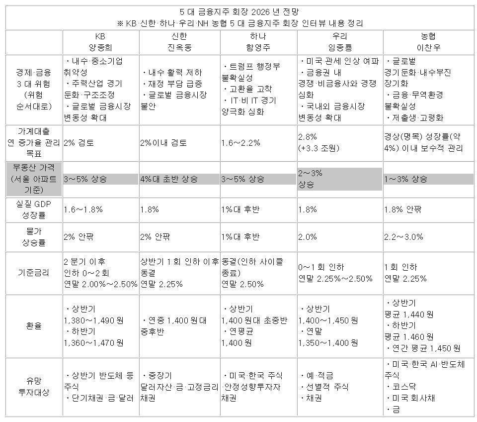 한국 금융계를 이끄는 5대 지주 회장은 올해 가계대출 증가율을 명목 경제규모 성장률(약 4% 전망)의 절반 수준에서 억제하고, 대신 정부 방침에 따라 '생산적 금융'에 주력하겠다는 의지를 밝혔다.