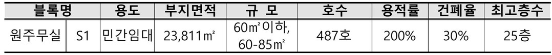 원주무실 S1 블록은 총 487호의 실버스테이를 공급하며, 이 중 최소 300호 이상을 실버스테이로 조성할 수 있다. KTX 원주역과 중앙고속도로 남원주 IC 인근에 위치해 수도권 접근성이 뛰어나며, 원주의료원과 원주세브란스병원이 가까워 고령자 주거지로 적합하다. 전용면적 60㎡ 이하 146호, 60~85㎡ 이하 341호로 구성되며, 일반 공공지원 민간임대와 혼합형 단지로 개발될 수 있다.