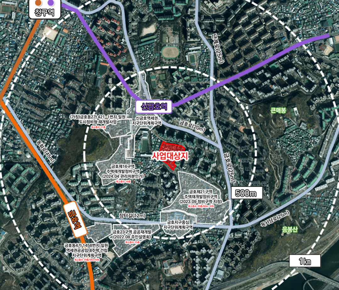 대상지는 지하철 5호선 신금호역 인근으로, 광화문·종로 등 강북 도심권과 여의도 접근성이 뛰어난 입지를 갖추고 있다. 인근에는 응봉근린공원과 대현산 배수지 공원 등이 위치해 녹지환경이 우수하고, 왕십리 생활권과도 가까워 직주근접형 주거지로서의 잠재력이 높다는 평가다.