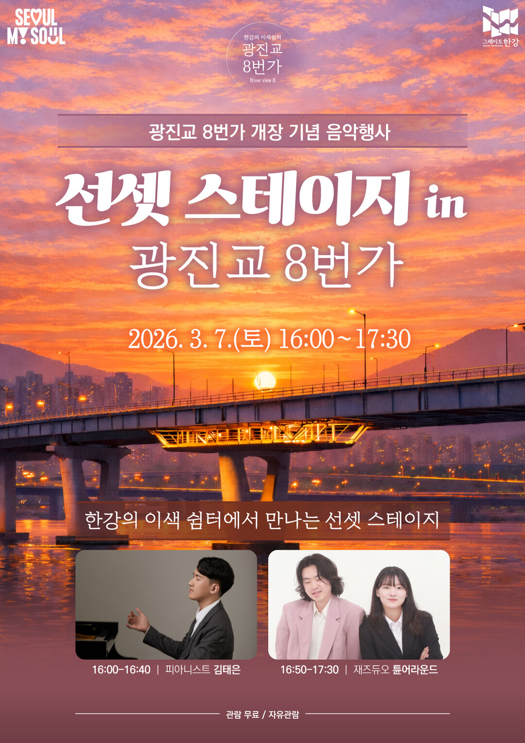 올해는 요가 클래스, 가족 실내캠핑, 음악 공연 등 다채로운 프로그램이 운영된다. 특히 7일(토)에는 개장 기념 공연 ‘선셋 스테이지 in 광진교 8번가’가 열려 시민들에게 색다른 음악 경험을 선사한다. 라운지 내 포토존도 새롭게 마련돼 가족과 함께 추억을 남기기에 제격이다.