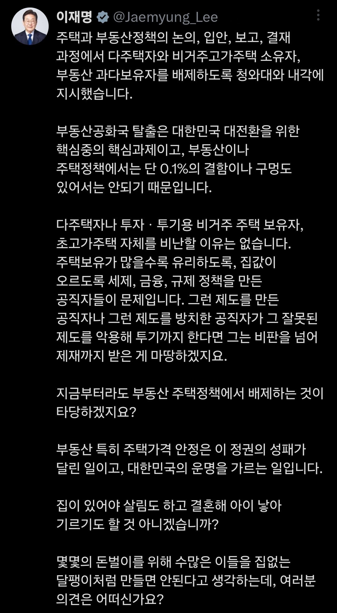이 대통령은 이날 자신의 SNS(X·옛 트위터)를 통해 "주택과 부동산 정책의 논의·입안·보고·결재 과정에서 다주택자와 비거주 고가 주택 소유자, 부동산 과다 보유자를 배제하도록 청와대와 내각에 지시했다"고 밝혔다. 이 대통령은 특히 "부동산 공화국 탈출은 대한민국 대전환을 위한 핵심 중의 핵심 과제"라며 "부동산이나 주택 정책에서는 단 0.1%의 결함이나 구멍도 있어서는 안 된다"고 강조했다.