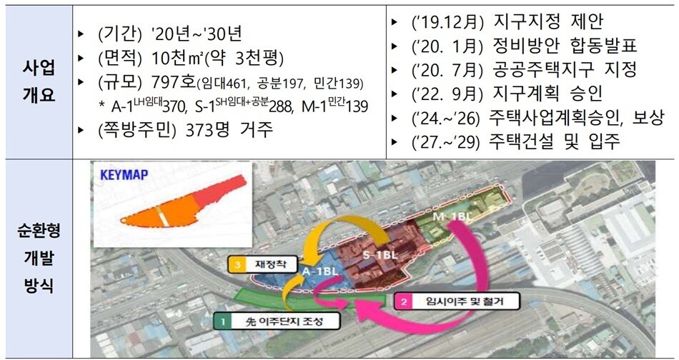 ‘쪽방촌 공공주택사업’은 낙후된 도심 주거지를 정비해 취약계층의 주거환경을 개선하고, 도심 활력을 제고하는 것을 목표로 한다. 특히 주민 내몰림을 방지하기 위해 ‘순환형 개발방식’을 적용, 선개발 부지부터 이주와 임대주택 건설을 진행한 뒤 잔여 부지를 개발하는 방식으로 추진된다.