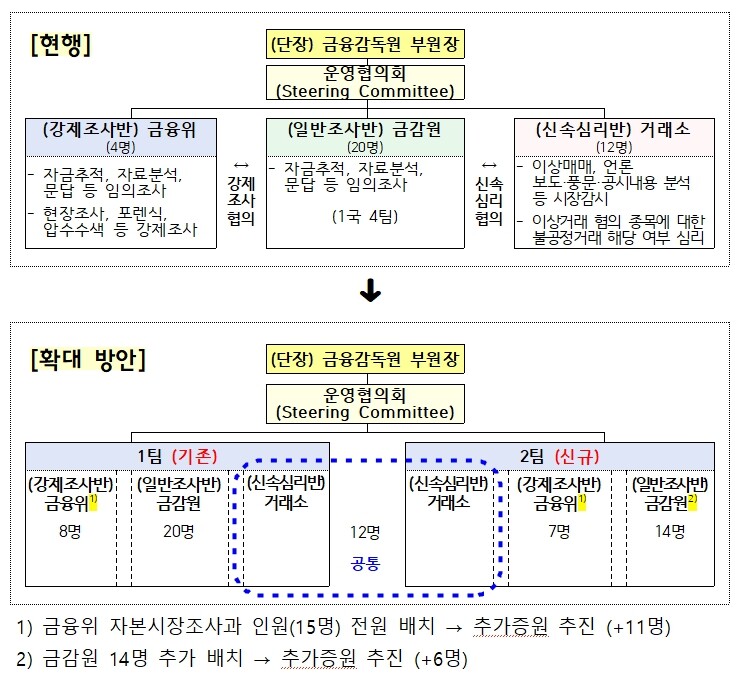 현재 합동대응단은 강제조사반(금융위), 일반조사반(금감원), 신속심리반(거래소)의 3반 1팀 체제지만 이번 개편에 따라 강제조사반과 일반조사반 1개씩을 신설하여 강제조사반-일반조사반-신속심리반(양팀 공통 지원) 구성의 2개 팀을 운용하게 된다.