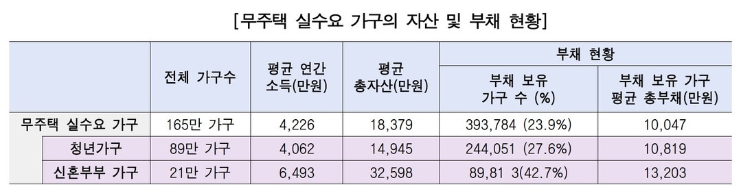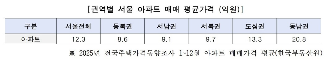 무주택 실수요 가구의 평균 연소득은 4,226만 원, 평균 자산은 1억8천만 원으로 나타났다. 청년 가구는 평균 소득 4,062만 원, 자산 1억5천만 원 수준이며, 신혼부부는 평균 소득 6,493만 원, 자산 3억3천만 원으로 상대적으로 높았다. 그러나 서울 아파트 평균 매매가는 12.3억 원으로 전국 평균(4.9억 원)을 크게 웃돌아, 소득·자산만으로는 주택 구입이 사실상 어렵다는 분석이다.