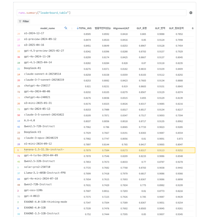 카카오 관계자는 “상위권을 기록한 카나나 모델은 한국어와 영어 모두에서 강력한 성능을 보이는 초거대 범용 언어모델”이라며 “대규모 서비스 트래픽을 효율적으로 처리할 수 있는 고효율 구조로 고도화 중인 카나나 2.0 개발에도 집중하고 있다”고 말했다.