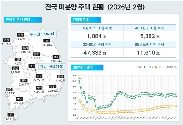 전체 미분양은 6만6천208가구로 전월보다 0.6%(368가구) 줄었으나, 준공 후 미분양만은 반대로 늘었다.