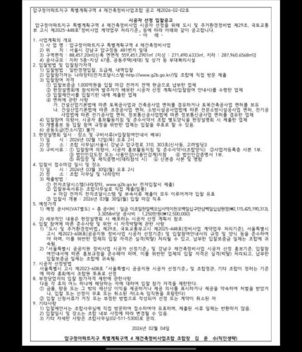 [도시경제채널 = 유덕부 기자] 서울 강남구 압구정동 481번지 일대에서 추진 중인 압구정 4구역 재건축 사업이 본격적인 시공사 선정 절차에 돌입했다. 총 공사비는 2조1154억 원, 평당 단가는 1,250만 원에 달하는 초대형 프로젝트로, 국내 재건축 역사상 손꼽히는 규모다. 최고 67층, 1,664세대의 공동주택과 부대복리시설이 들어설 예정이며, 입찰 방식은 일반경쟁입찰·도급제·내역입찰로 진행된다.