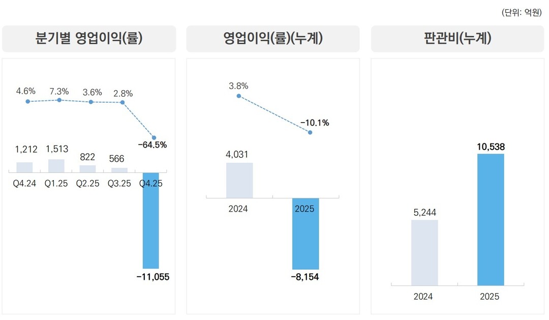 [도시경제채널 = 유덕부 기자] 대우건설은 2025년 연결 기준 매출 8조546억 원을 기록하며 전년 대비 23.3% 감소했다고 9일 밝혔다. 영업손익은 8,154억 원, 당기순손익은 9,161억 원 손실을 내며 모두 적자로 돌아섰다. 특히 4분기에만 영업손실 1조1,055억 원, 순손실 8,781억 원이 집중되면서 연간 손실의 대부분이 이 시기에 반영됐다.