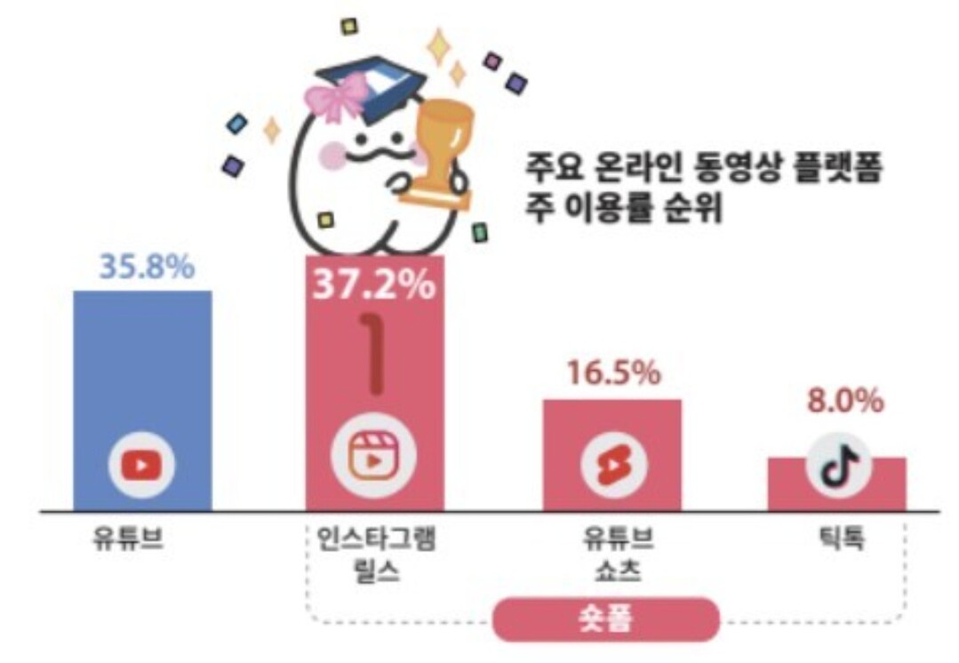 보고서는 "온라인 동영상 플랫폼의 단순 이용 경험률은 유튜브가 가장 높았지만 자주 이용하는 플랫폼에서는 인스타그램 릴스가 유튜브를 추월했다"며 "청소년의 온라인 동영상 소비 중심축이 롱폼에서 숏폼으로 이동한 것으로 보인다"고 말했다.