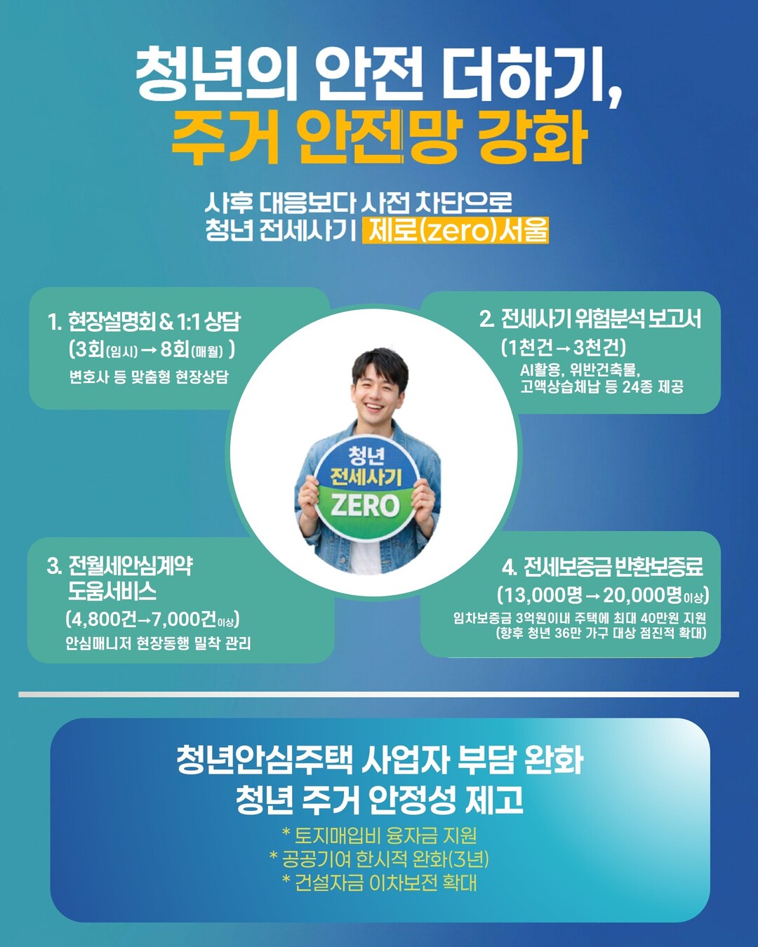 AI 기반 ‘전세사기 위험분석 보고서’ 제공 규모를 기존 1천건에서 3천건으로 확대한다. 공인중개사 자격의 ‘안심매니저’가 계약 전 과정을 동행 상담하며, 전세보증금 반환보증 보증료 지원 인원을 2만 명까지 늘린다. 청년안심주택 거주자에게는 보증금 무이자 지원과 월세 지원을 병행한다.