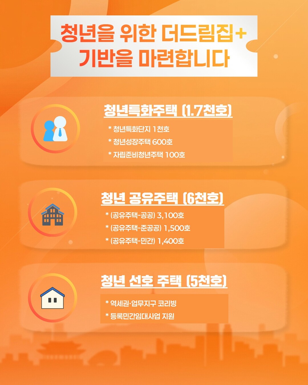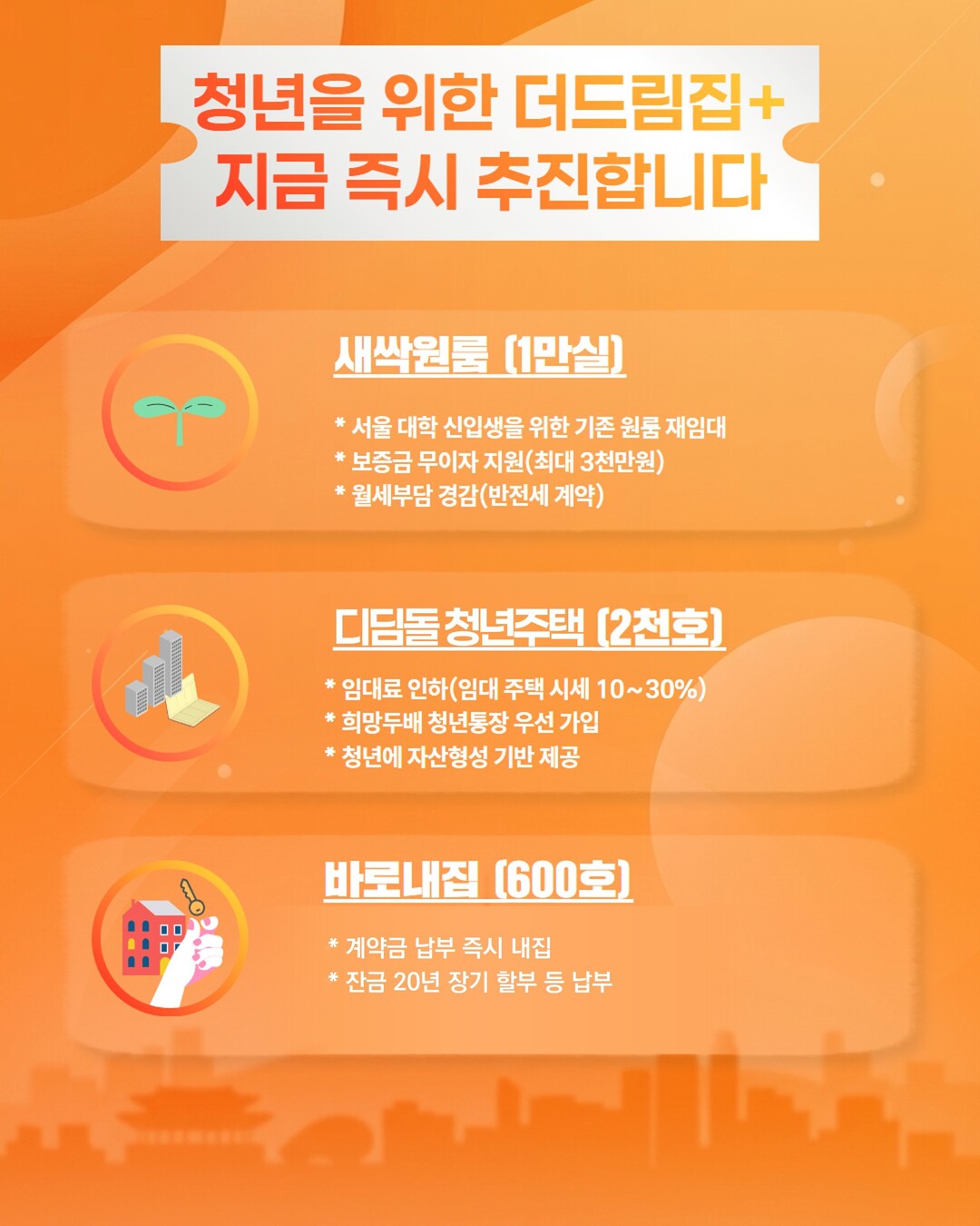 서울시는 기존 4만9천호 공급 계획에 더해 도심 잠재 공급 2만5천호를 추가 발굴, 총 7만4천호를 공급한다. 대학 신입생을 위한 ‘서울형 새싹원룸’(1만호), 대학 인근 ‘청년 공유주택’(약 6천호), 산업클러스터 종사자를 위한 ‘청년성장주택’(600호) 등 맞춤형 주택을 단계적으로 추진한다. 또한 청년층이 대출 없이 내 집을 마련할 수 있는 ‘바로내집’ 모델을 도입해 600호를 공급한다.