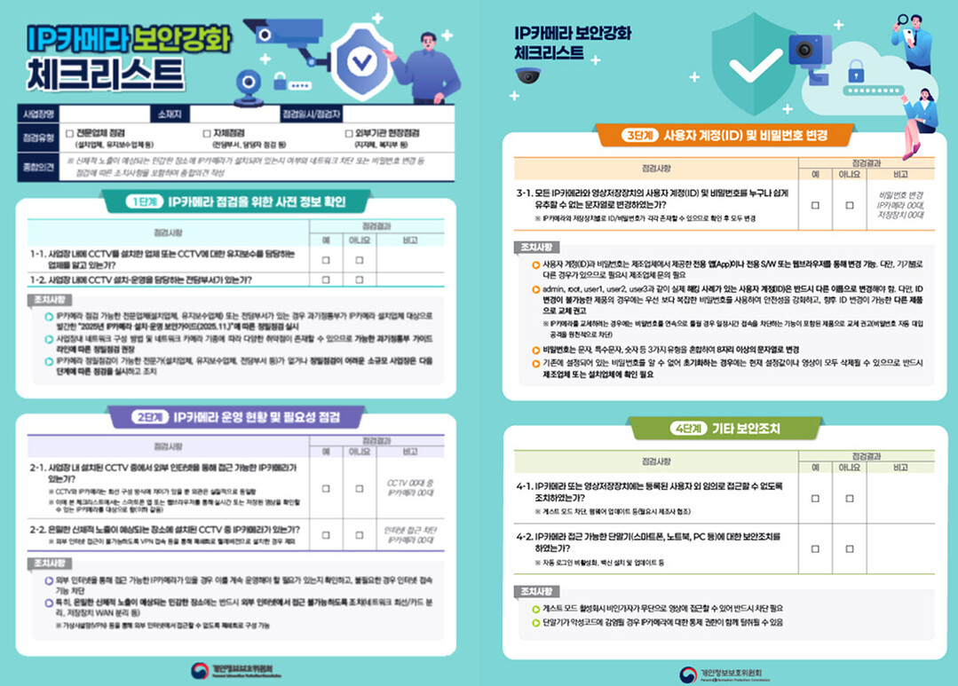 이번 캠페인은 앞서 지난해 12월 관계부처 합동으로 발표한 ‘IP카메라 보안 관리체계 고도화 방안’의 후속 조치로, 개인정보위는 소규모 사업장에서도 손쉽게 활용할 수 있는 ‘IP카메라 점검 체크리스트’를 마련해 공공시설물과 의료기관 등 소규모 사업장에 대한 자율점검과 보안조치 이행을 적극 추진할 계획이다.