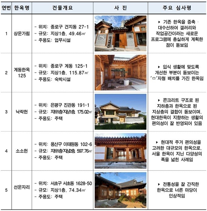 이번에 최고 점수를 받은 ‘상운가림’은 기존 한옥을 갤러리와 작업공간으로 탈바꿈시킨 사례로, 시민 온라인투표에서도 최다 득표를 얻어 ‘올해 서울한옥’과 ‘올해 공감한옥’을 동시에 차지했다. ‘계동한옥 125’는 입식 생활에 맞춘 ‘ㅁ’자형 배치가 돋보이는 숙박시설로, ‘낙락헌’은 콘크리트 지하층과 한옥 지상층을 결합해 생활 편의성을 구현했다. ‘소소헌’은 대형 주택으로 한옥의 다양성을 확장한 사례, ‘선운자리’는 전통성을 간직한 너른 마당이 인상적인 주택으로 평가받았다.