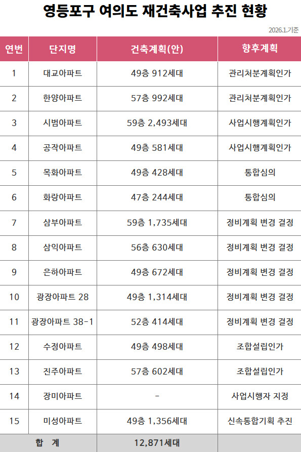 기존 중·저층 아파트 중심이던 여의도는 현재 대부분의 재건축 단지가 47~59층 규모의 고층 설계를 검토하거나 확정한 상태다. 대교아파트(49층, 912세대), 한양아파트(57층, 992세대)는 사업시행계획 인가 이후 관리처분계획 인가를 준비 중이며, 삼부아파트(59층, 1,735세대), 광장아파트28(49층, 1,314세대) 등은 초고층 대단지로의 전환이 예정돼 있다.