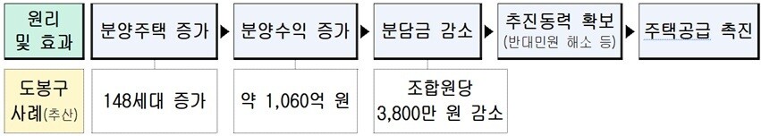 현재까지 도시계획위원회 심의를 통과한 57개 단지들은 평균 47세대의 일반분양이 늘어나면서 조합원 분담금 경감 효과가 나타났다. 대표적으로 도봉구 방학신동아1단지는 보정계수 2.0을 적용받아 허용용적률 인센티브가 20%에서 40%로 확대됐다.