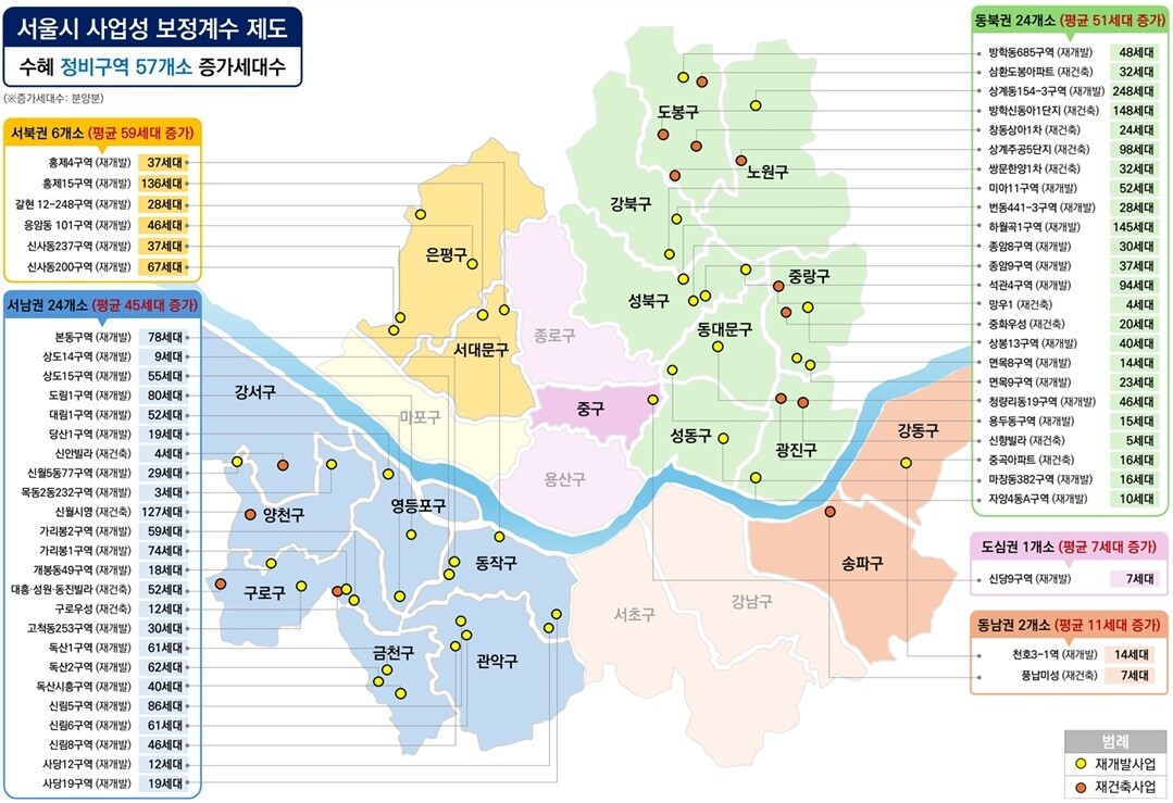 이 가운데 95%에 달하는 54곳이 강북권(30곳)과 서남권(24곳)에 집중돼 지역 간 사업성 격차를 해소하는 효과를 보였다. 사업성 보정계수는 지가와 기존 주택 규모, 과밀 정도 등을 고려해 허용용적률을 최대 2배까지 높여주는 제도로, 분양수익을 기대하기 어려운 지역의 사업성을 개선하는 장치다.