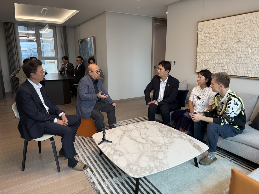 이날 이들은 래미안 원펜타스를 먼저 둘러본 뒤 회의실에서 심층 대화를 가졌다. 우드 부사장은 “래미안 원펜타스는 고급스럽고 조형미가 뛰어나지만, 지상부의 일부 공간이 단조롭게 보인다”며 “대교아파트는 사람들을 자연스럽게 끌어들이는 공간으로 설계하겠다”고 말했다. 삼성물산 측은 Value Engineering 개념을 통한 효율적 설계, 공공성과 프라이버시를 조화한 주거 동선 등을 제시하며 의견을 교환했다.