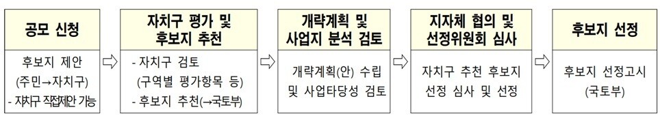 기존에는 자치구 추천 방식이 중심이었지만, 이번에는 주민 의견을 후보지 선정 단계부터 반영해 참여 폭을 넓혔다. 주민들은 국토부 홈페이지에서 신청 서류를 내려받아 해당 자치구에 제출하면 된다.