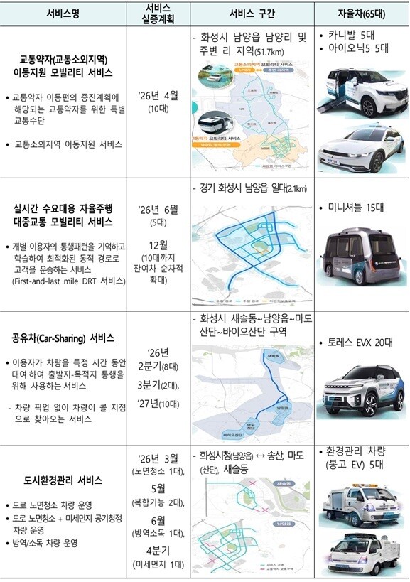 화성 리빙랩에서 선보이는 서비스는 총 8가지로, 시민 체감도가 높은 공공 영역에 집중되어 있다. ▲교통소외지역 이동지원 ▲수요응답형 대중교통(DRT) ▲공유차 서비스는 물론, ▲노면 청소 ▲도로 모니터링 ▲응급환자 이송 ▲마을버스 ▲순찰 로봇 등이 순차적으로 실도심에 투입된다.