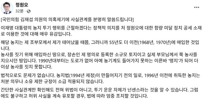 정 구청장은 같은 날 오후 페이스북에 글을 올려 “대통령의 정책 의지를 저에 대한 함량 미달 정치 공세 소재로 이용한 것에 대해 매우 유감”이라며 “허위 사실 유포가 계속될 경우 법적 조치를 취하겠다”고 경고했다. 그는 “간단한 사실관계만 확인해도 위법이 아님을 알 수 있다”며 투기 의혹 자체가 ‘넌센스’라고 강조했다.