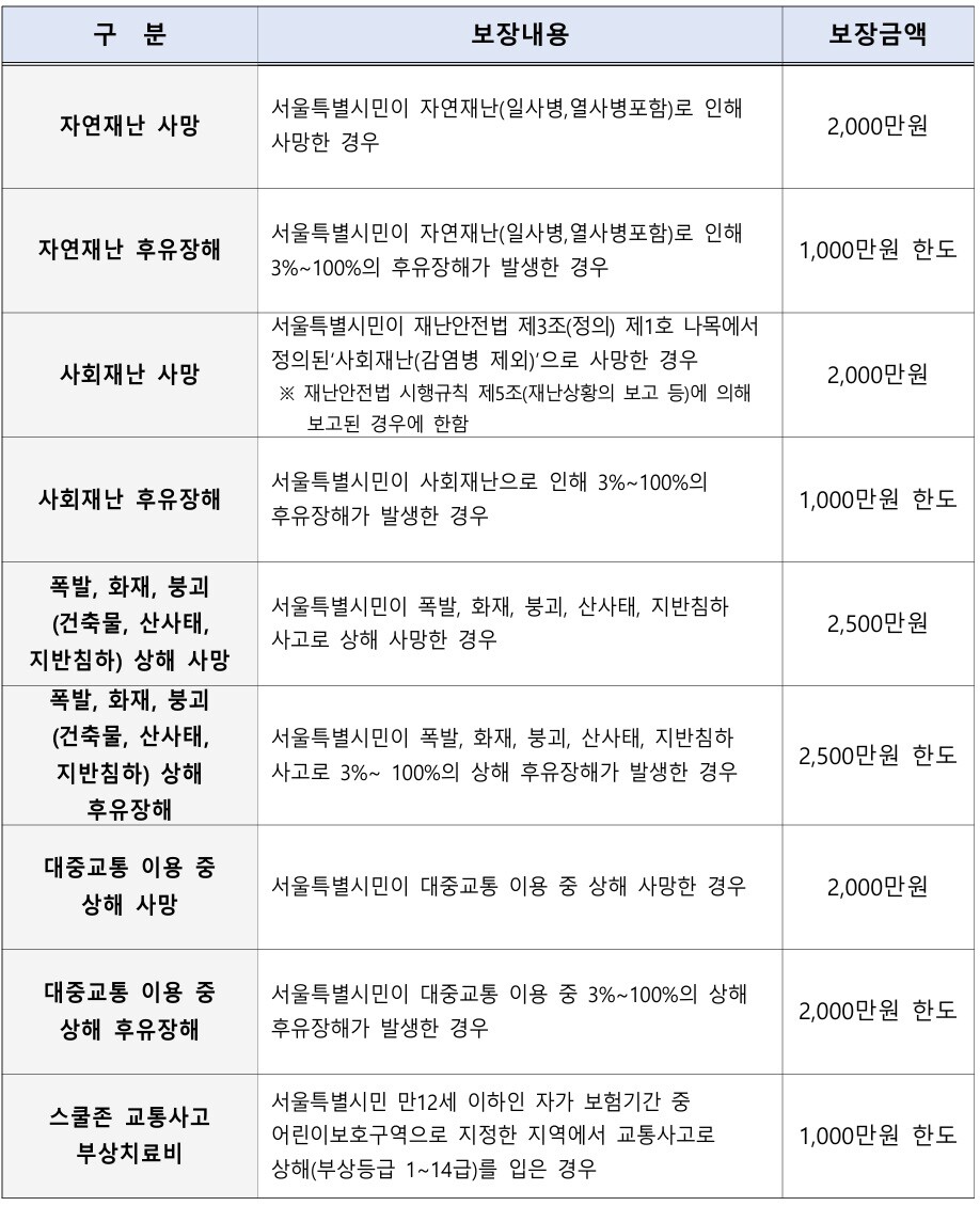 한병용 서울시 재난안전실장은 “예기치 못한 사고와 재난으로 어려움을 겪는 시민의 일상 회복에 도움이 되길 바란다”며 “다양한 재난으로부터 시민의 생명과 일상을 지키는 안전망을 지속적으로 보완해 나가겠다”고 강조했다.