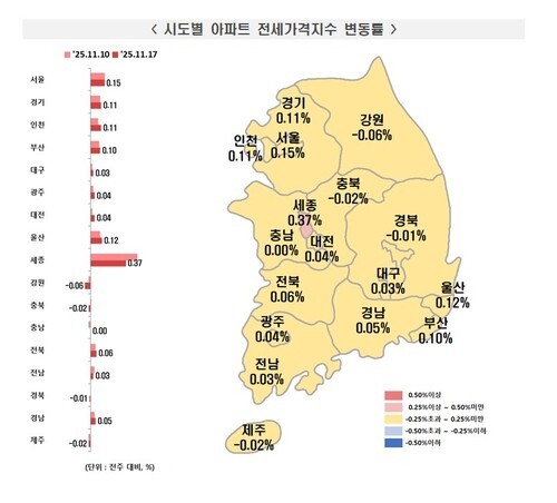 지방(0.04%)은 직전 주와 상승폭이 동일했다. 5대 광역시는 0.07%, 8개 도는 0.01% 각각 올랐고 세종은 대단지 위주로 임차 수요가 지속되며 0.37% 상승했다.