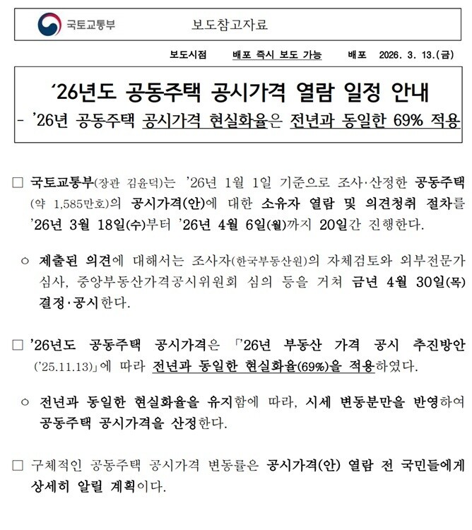국토교통부(장관 김윤덕)가 오는 18일부터 전국 약 1,585만 호의 공동주택을 대상으로 '2026년도 공시가격(안)' 소유자 열람 및 의견 청취 절차에 돌입한다고 13일 밝혔다.