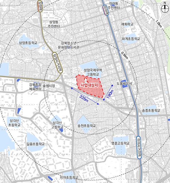 교통·경관 계획도 함께 수립됐다. 인접한 미아2재정비촉진지구와 연계해 관련 도로를 4차선에서 6차선으로 확장하고, 보행자와 차량을 분리한 통학로를 정비한다. 단지 배치는 솔샘로 방향 저층부에서 내부로 갈수록 층고가 높아지는 방식을 채택해 북한산 조망을 확보하기로 했다. 학교 인접 구역에는 공원을 배치하고, 삼양사거리역과 연결되는 솔샘로 저층부에는 근린생활시설을 집중 배치해 가로 상가의 연속성을 유지할 방침이다.