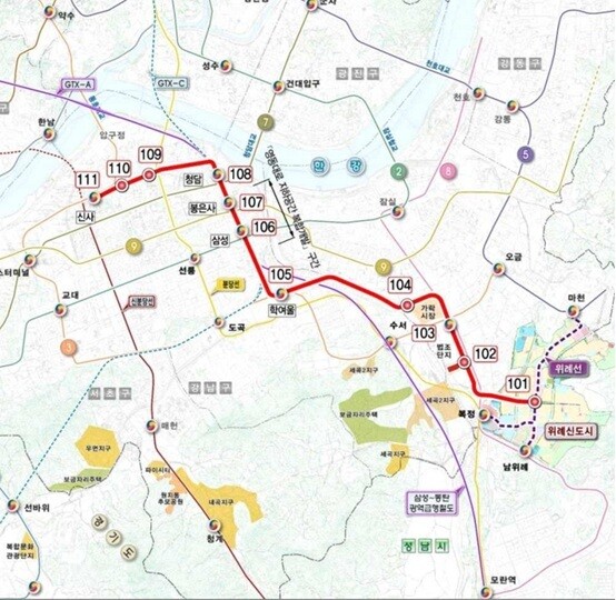 위례신사선은 위례신도시에서 삼성역과 신사역을 연결하는 14.8km 규모의 도시철도 사업이다. 총사업비는 1조 9,367억 원이 투입되며, 정거장 11개소가 신설된다. 사업이 완료되면 위례중앙역에서 삼성역까지 이동시간이 48분에서 14분으로, 신사역까지는 56분에서 24분으로 단축된다. 강남권 중심업무지구와 수도권 광역철도망(GTX-A·C)과의 연계도 강화돼 교통 편의성이 크게 개선될 전망이다.