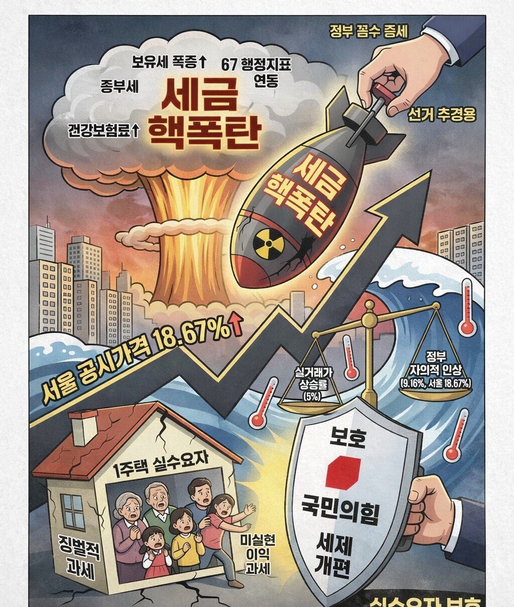 [도시경제채널 = 윤문용 기자] 올해 서울 아파트 공시가격이 18.67%라는 기록적인 수치로 치솟으면서, 은퇴 후 집 한 채로 노후를 보내던 고령층과 실수요자들 사이에서 “벌어들인 소득도 없는데 세금 때문에 쫓겨날 판”이라는 비명이 터져 나오고 있다. 야당인 국민의힘은 이를 “정책 실패의 책임을 국민에게 전가하는 세금 약탈”이라며 강도 높게 비판하고 나섰다.