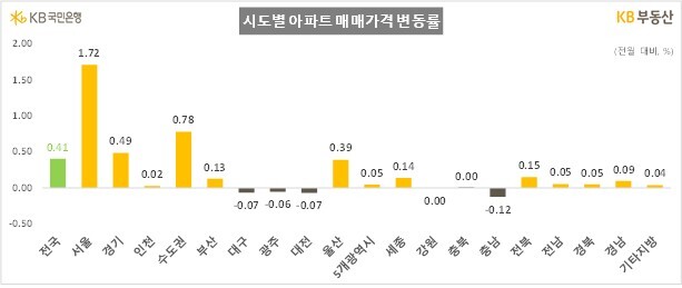 전국 아파트 매매가격 상승률은 0.41%로 전월(0.28%) 대비 오름폭이 0.13%포인트 확대됐다.