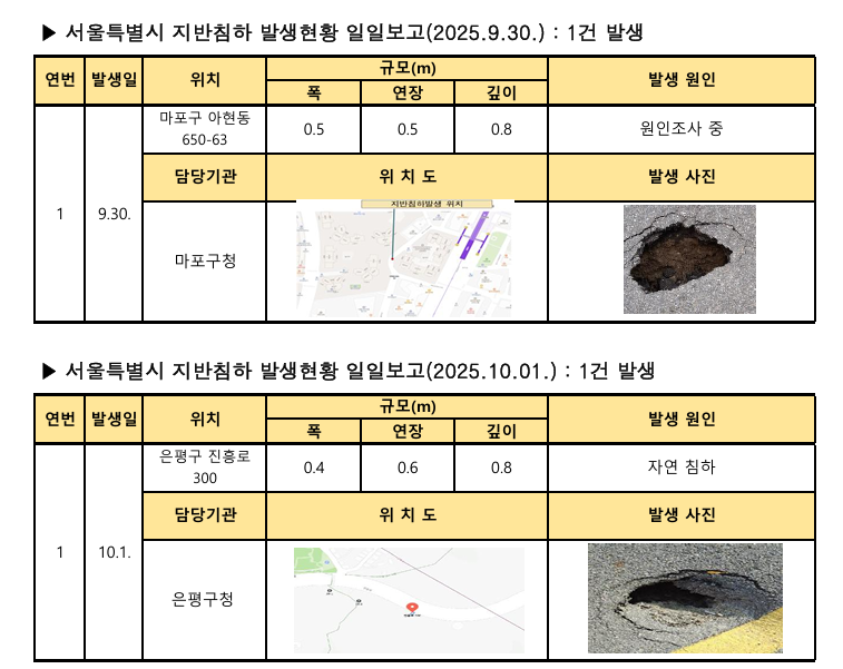 11일 국회 국토교통위원회 소속 더불어민주당 복기왕 의원실이 서울시로부터 제출받은 ‘서울시 지반침하 현황’을 분석한 결과에 따르면 최근 6년간(2020년~2025년 8월) 서울에서 총 122건의 땅꺼짐 사고가 발생했다.