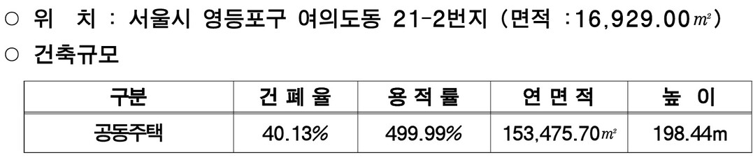 재건축 계획은 여의도의 금융중심지 입지를 반영해 주거와 업무, 상업 기능을 결합한 복합주거공간을 만드는 데 중점을 두었다. 북측의 한강과 여의도공원을 고려해 개방감과 통경축을 확보하고, 주변과 조화로운 스카이라인을 형성한다.