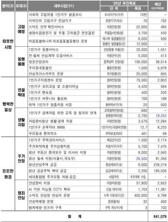 시는 올해 6,316억 원의 예산을 확보해 고립 예방, 생활 자립, 주거 안정 등 3대 축을 중심으로 총 31개 사업을 추진한다. 특히 이번 계획은 기존 개별 사업들을 통합하고 연계하여 시민들이 더 쉽게 서비스를 이용할 수 있도록 '구조 개선'에 방점을 찍었다. 시는 고립 위험 가구를 발굴하고 동행 돌봄을 강화해 촘촘한 사회적 안전망을 구축할 방침이다.