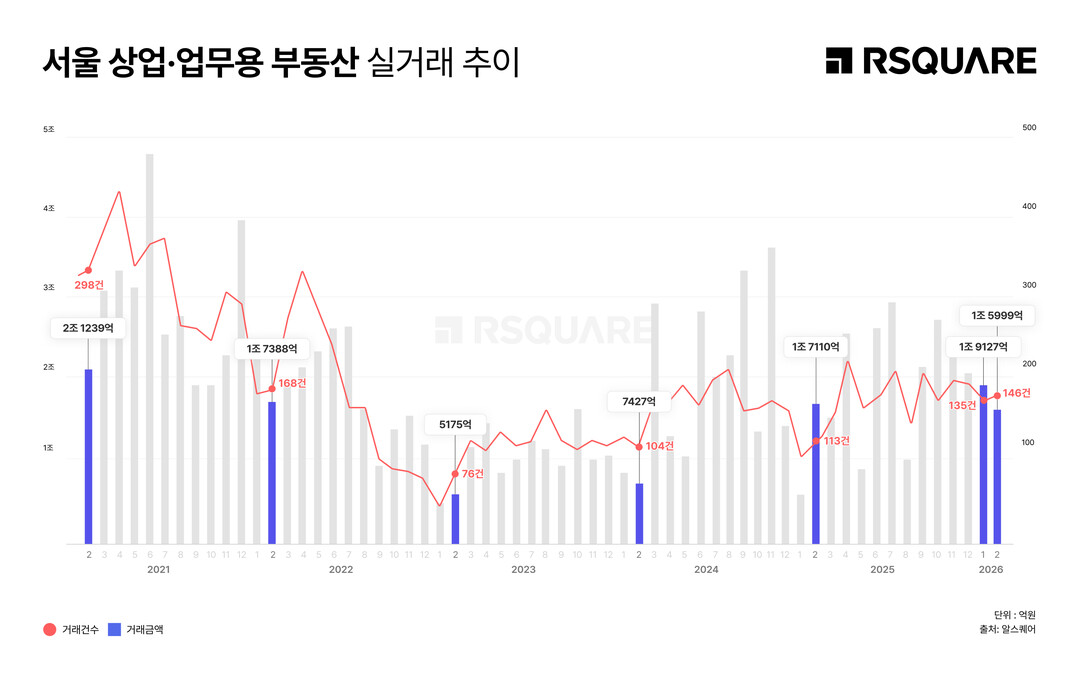 최근 5년간 2월 기준 서울 상업·업무용 부동산 거래 규모는 변동성을 보였고 2021년 2조 1,239억 원, 2022년 1조 7,388억 원 수준에서 2023년에는 5,175억 원까지 급감했다. 이후 2024년 7,427억 원, 2025년 1조 7,110억 원으로 회복세를 보였으며, 2026년에는 1조 6,000억 원으로 소폭 조정됐다.