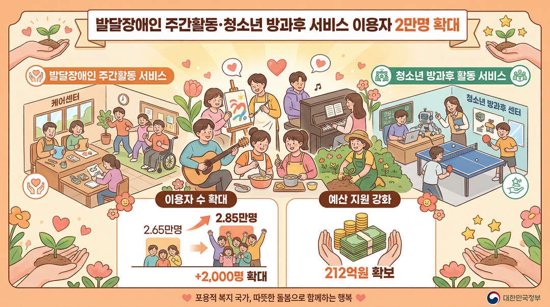 기획예산처 보도자료에 따르면, 이번 추경 중 민생 안정 항목(2.8조원)에는 취약계층을 대상으로 한 돌봄 서비스 확대 내용이 반영됐다. 발달장애인 대상 주간활동 및 청소년 방과후 활동 서비스 이용자를 기존 2.65만 명에서 2.85만 명으로 늘리는 데 212억원이 편성됐다.