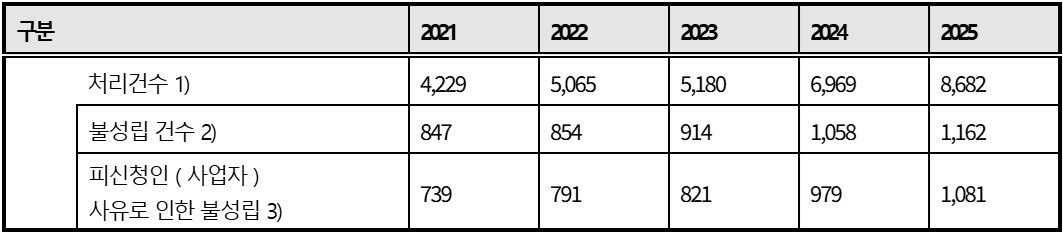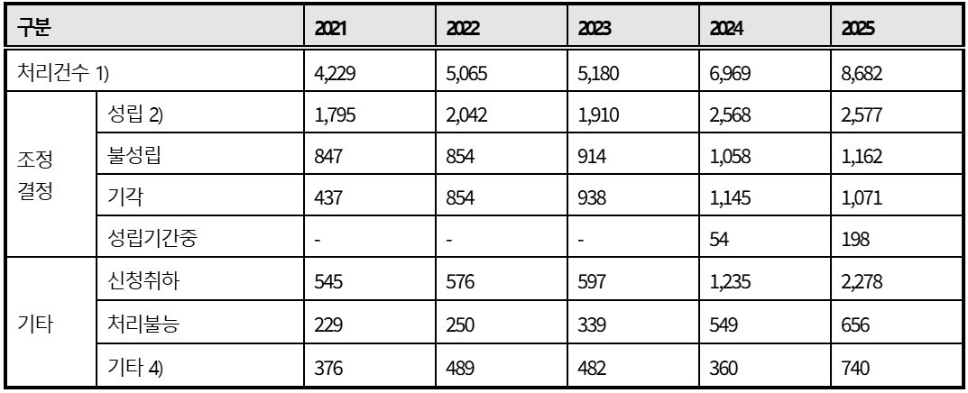 국회 정무위원회 소속 김남근 의원(서울 성북을)이 19일 한국소비자원으로부터 제출받은 자료에 따르면 2021년 4,229건이던 분쟁조정 처리 건수는 2025년 8,682건으로 늘었으며, 같은 기간 불성립 건수는 847건에서 1,162건으로 증가했다. 특히 2025년 기준 전체 불성립 사건의 93%가 사업자 거부에 따른 것으로 집계됐다.