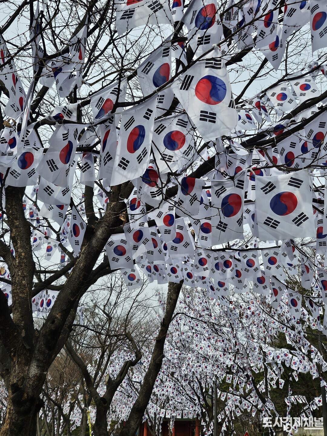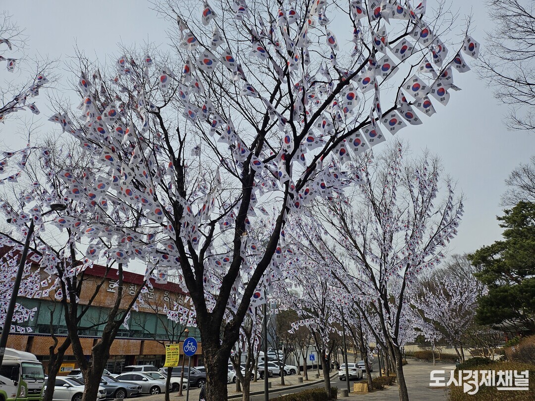 [도시경제채널 = 유주영 기자] 제107주년 3·1절을 맞아 서울 용산구 효창공원 일대가 거대한 '태극기 거리'로 변신했다. 효창공원앞역부터 정문에 이르는 510m 구간 가로수에는 잎사귀 대신 수백 개의 소형 태극기가 꽃처럼 매달려 시민들의 눈길을 사로잡는다.