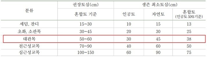 가이드라인은 현장에서 혼선을 빚었던 토심(흙 깊이) 기준을 현실화했다. 기존 ‘생육 최소토심’ 대신 ‘권장토심’을 도입해 식물 생육을 고려한 기준을 마련했다. 예를 들어 대관목의 경우 생존 최소토심은 38cm였으나 권장토심은 50~60cm로 확대됐다. 이를 통해 식물의 안정적인 생육과 장기적 유지관리를 도모할 수 있게 됐다.