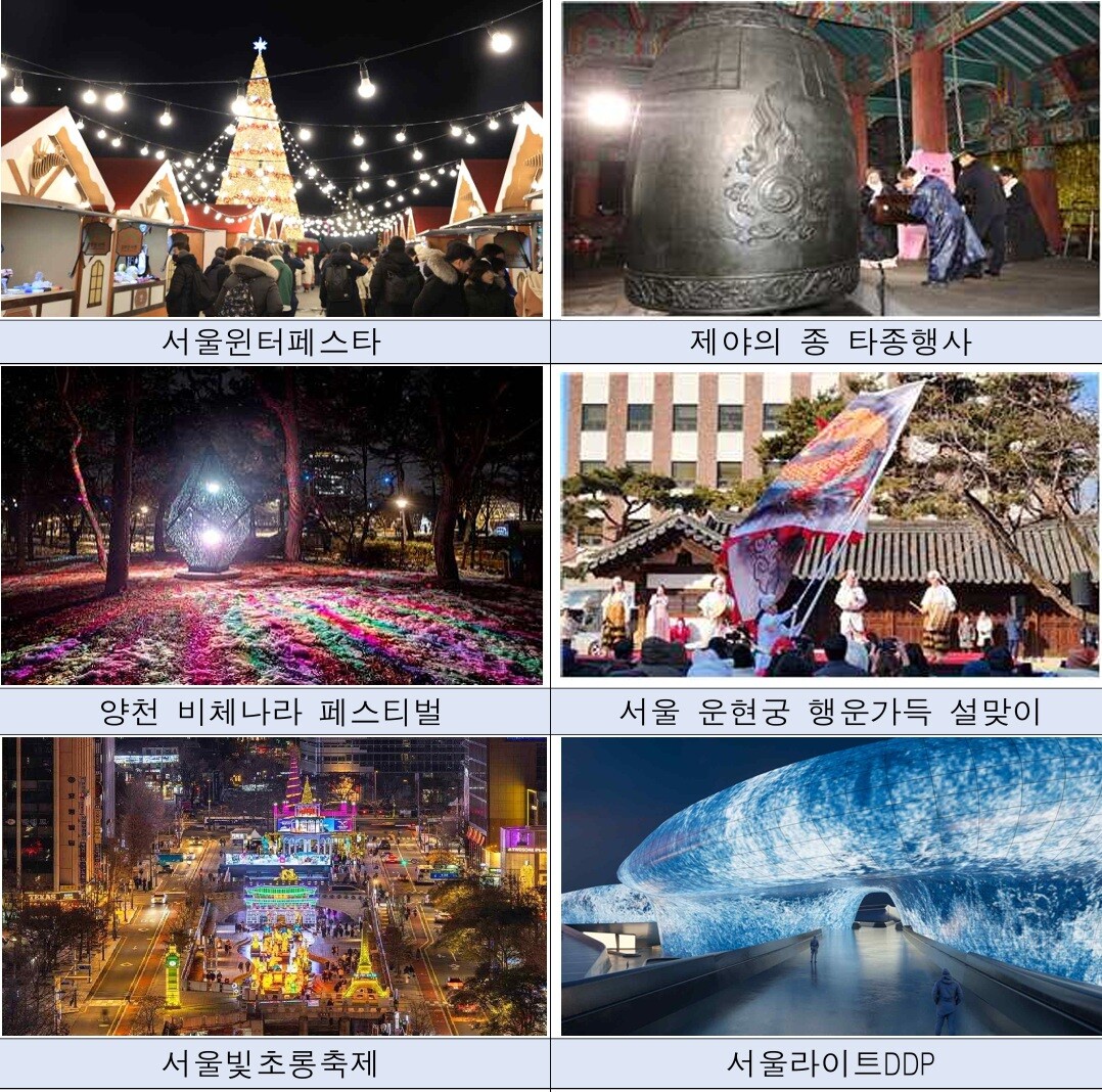 주요 축제로는 ‘빛’과 ‘K-콘텐츠’를 주제로 광화문, DDP, 청계천 일대에서 열리는 서울윈터페스타(12.12.~1.4.), 한 해의 끝과 새해의 시작을 알리는 제야의 종 타종행사(12.31.~1.1.)가 대표적이다. 이외에도 창작무용 공연을 선보이는 제46회 서울무용제(11.21.~12.7.), 전통놀이와 공예체험으로 설날을 즐기는 2026 서울 운현궁 설맞이 축제(2.16.~2.18.) 등이 시민들을 기다린다.