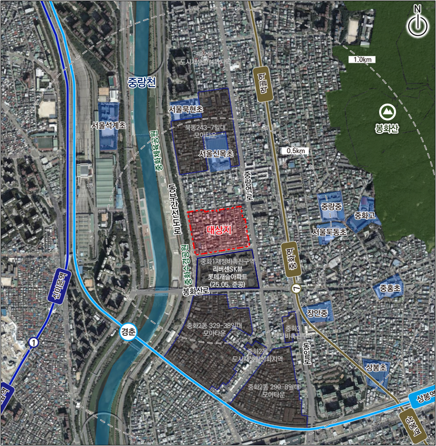 [도시경제채널 = 유주영 기자] 서울 중랑구 중화2동 309-39번지 일대가 재개발을 통해 총 1,280세대 규모의 수변 특화 주거단지로 탈바꿈한다. 사업성 보정계수와 용도지역 상향을 통해 기존 계획 대비 세대수가 42% 늘어나며, 중랑천과 봉화산을 연결하는 경관축과 스카이라인 조성으로 쾌적한 주거환경이 마련될 예정이다.