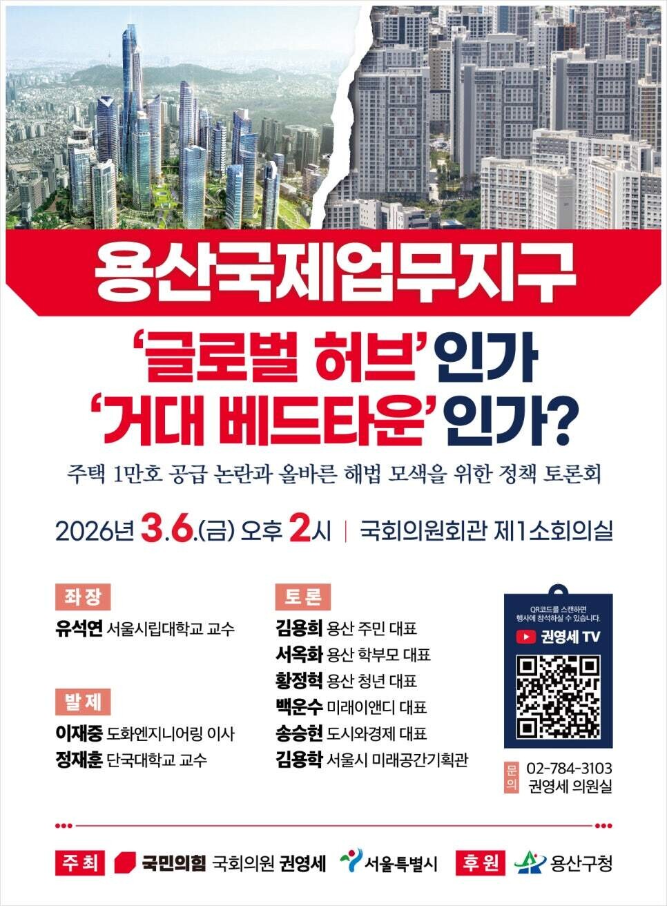 6일 국회 의원회관에서 용산 지역구 권영세 국회의원 주최로 열린 ‘용산국제업무지구 주택공급 토론회’에서는 정부의 1만 가구 공급 방안에 대한 비판이 쏟아졌다. 전문가들은 용산을 단순한 주택 공급지가 아닌 글로벌 업무 중심지로 바라봐야 한다며, 무리한 주택 확대가 도시 경쟁력을 약화시킬 수 있다고 지적했다.