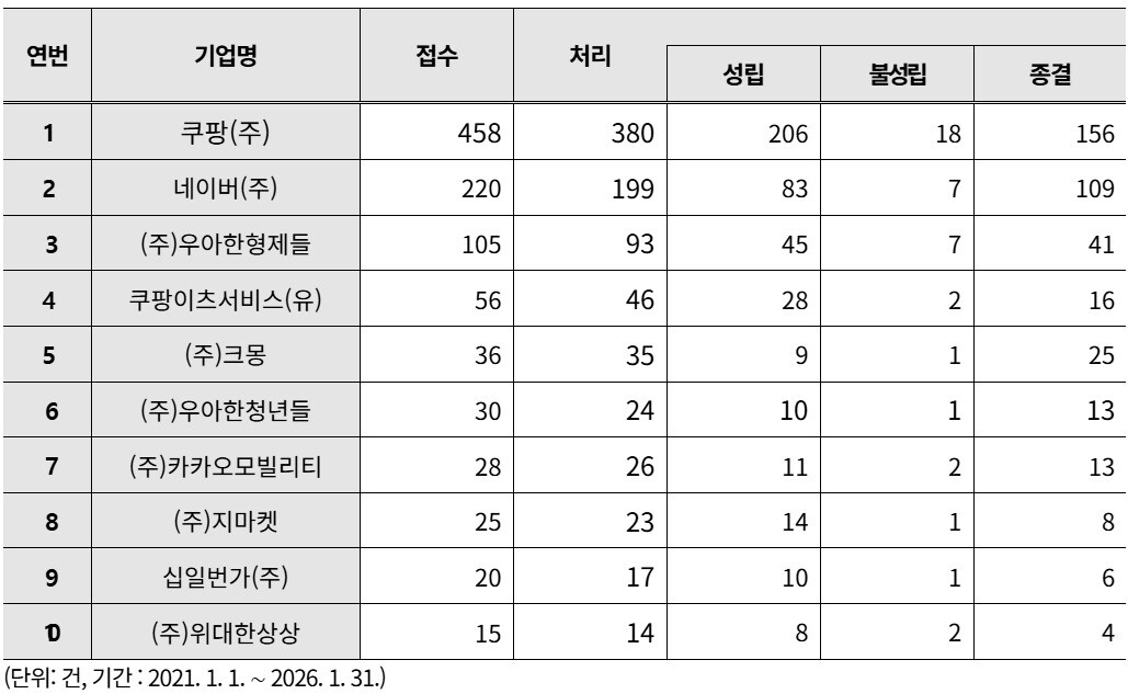 쿠팡 관련 분쟁은 매년 증가세를 보였다. 2021년 36건에서 시작해 2022년 51건, 2023년 70건, 2024년 101건, 2025년 171건으로 급증했다. 특히 2026년 1월 한 달 동안만 29건이 접수돼, 같은 기간 네이버(5건), 우아한형제들(3건), 쿠팡이츠(1건)와 비교해 압도적인 차이를 보였다.
