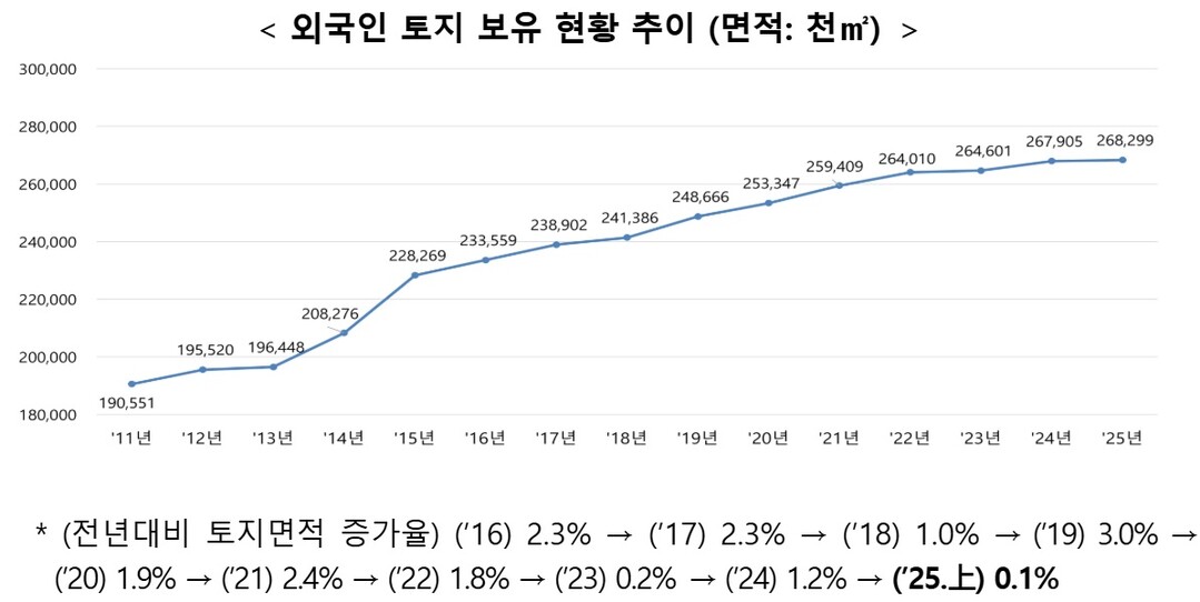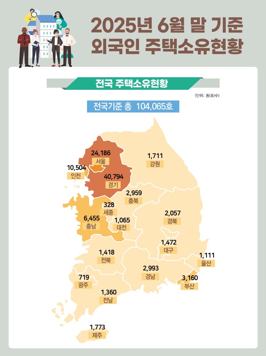 [도시경제채널 = 윤현중 기자] 국토교통부는 28일 2025년 6월 말 기준 외국인 토지·주택 보유 현황을 발표했다. 이번 통계에 따르면 외국인 보유 토지는 전체 국토의 0.27%에 해당하는 2억6,829만9천㎡로 집계됐으며, 외국인 소유 주택은 총 10만4,065호로 전체 주택의 0.53% 수준에 머물렀다. 증가세는 이어지고 있으나 직전 반기 대비 둔화된 것으로 나타났다.